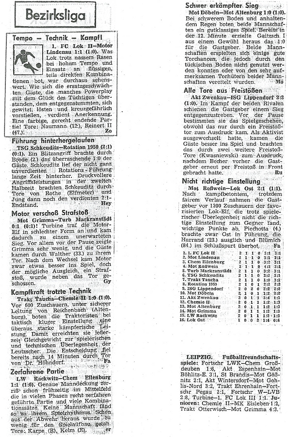 BL Motor Altenburg - Aktivist Zechau 3:0 vor 2.700 Zuschauern, Motor Döbeln - 1. FC Lok II 0:0 vor 1.600 Zuschauern |